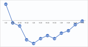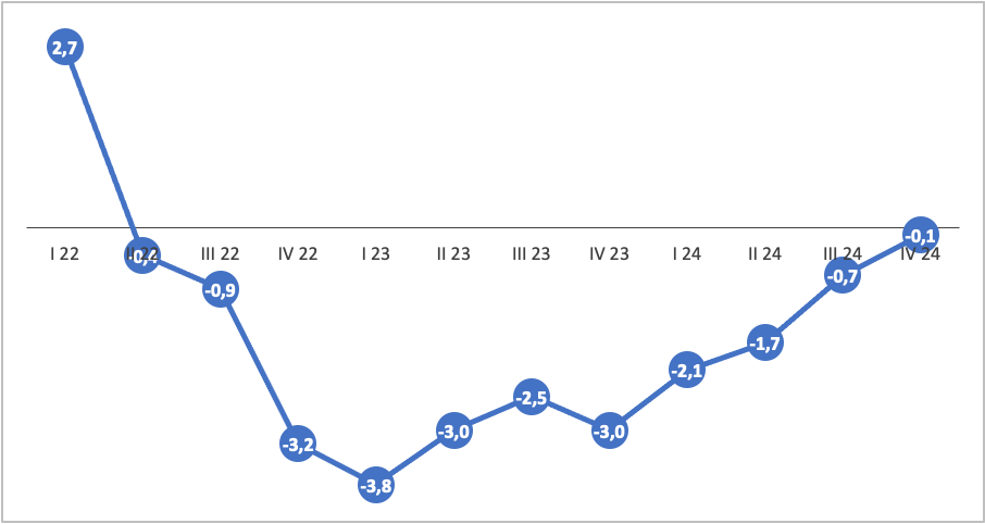 Joonis 1. Eesti SKP aheldatud väärtuse kvartaalne muutus võrreldes eelmise aasta sama perioodiga 2022–2024, %. [i]